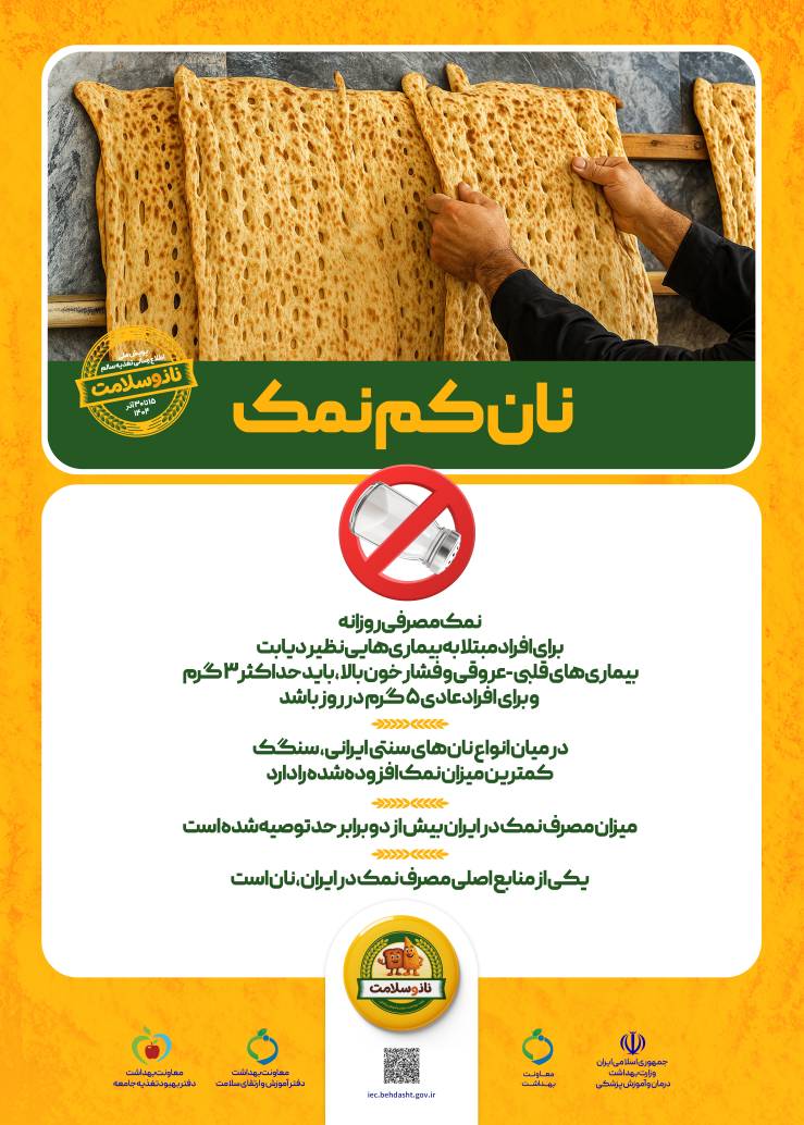 با توجه به افزایش شیوع بیماری های غیر واگیر یکی از اقدامات ضروری، افزایش سطح آگاهی و ارتقاء سواد تغذیه ای جامعه می باشد. در همین راستا دفتر بهبود تغذیه جامعه وزارت بهداشت، درمان و آموزش پزشکی کشور هر ساله، با هدف افزایش اطلاعات تغذیه ای جامعه، اقدام به برگزاری پویش ملی آموزش همگانی تغذیه سالم در سراسر کشور می نماید. در سال جاری نیز همچون سنوات گذشته این پویش با شعار "نان و سلامت" از 15 تا 30 آذر ماه در سراسر کشور به منظور ارتقاء آگاهی عمومی درباره اهمیت انتخاب نان سالم در سلامت جامعه برگزار می گردد.